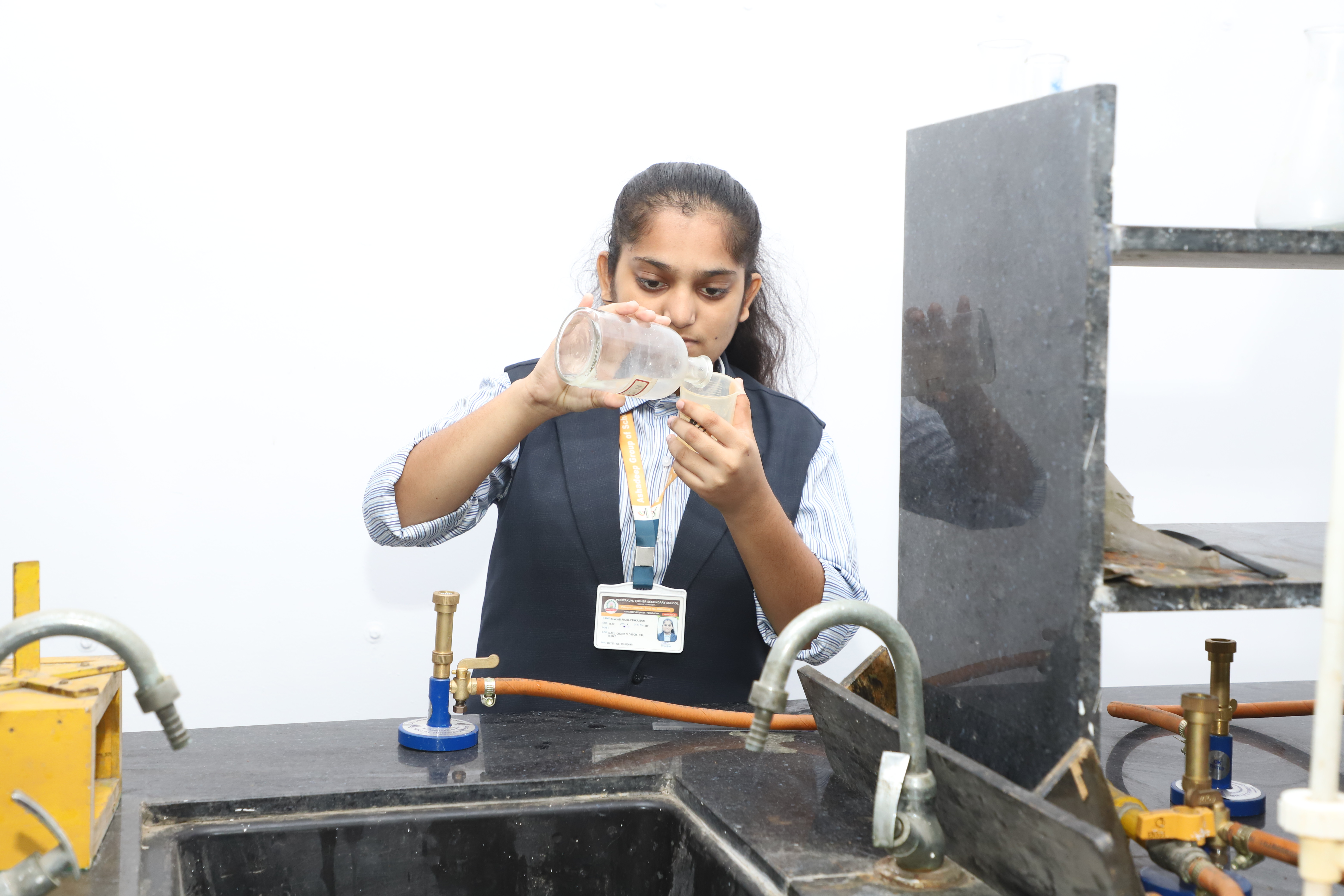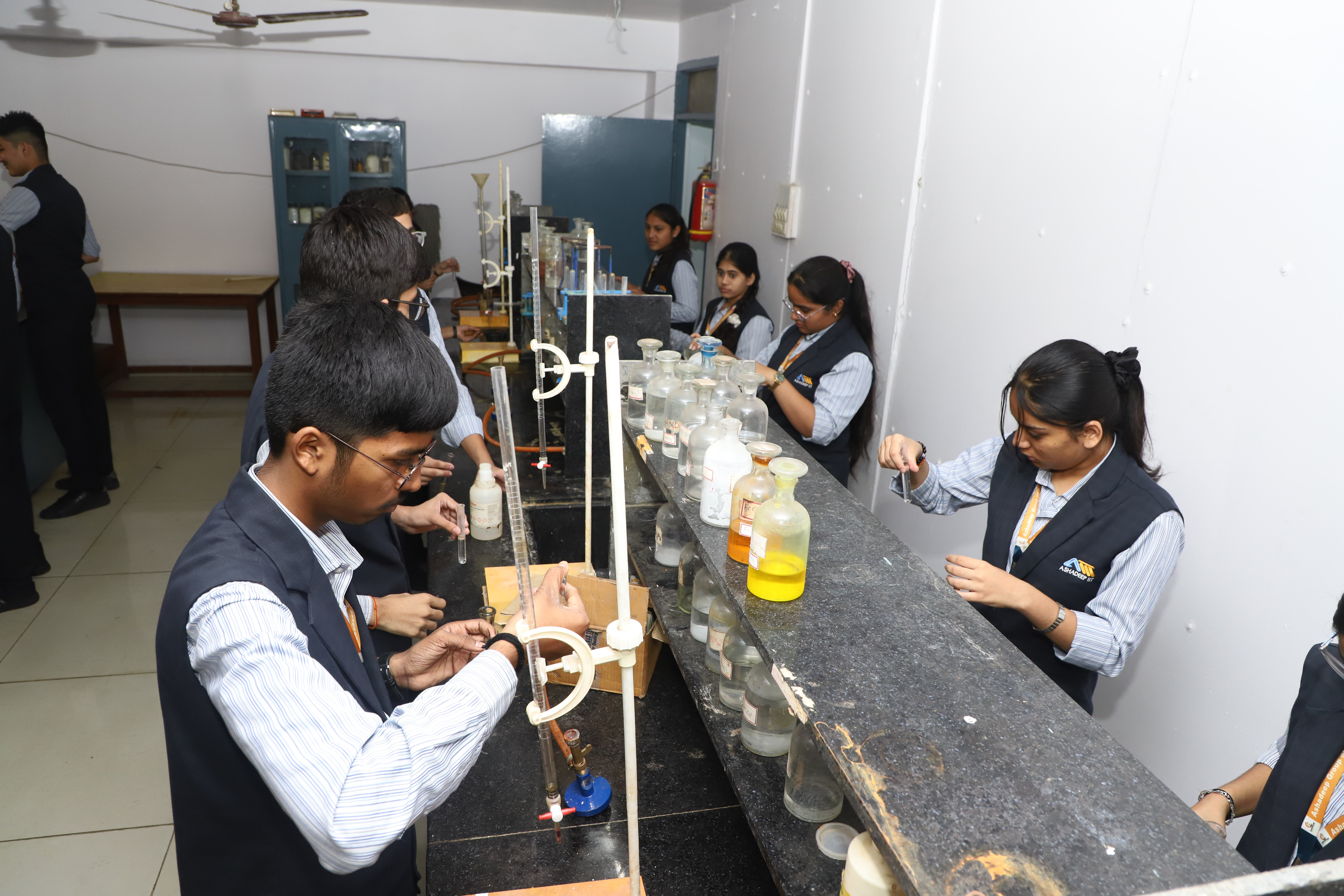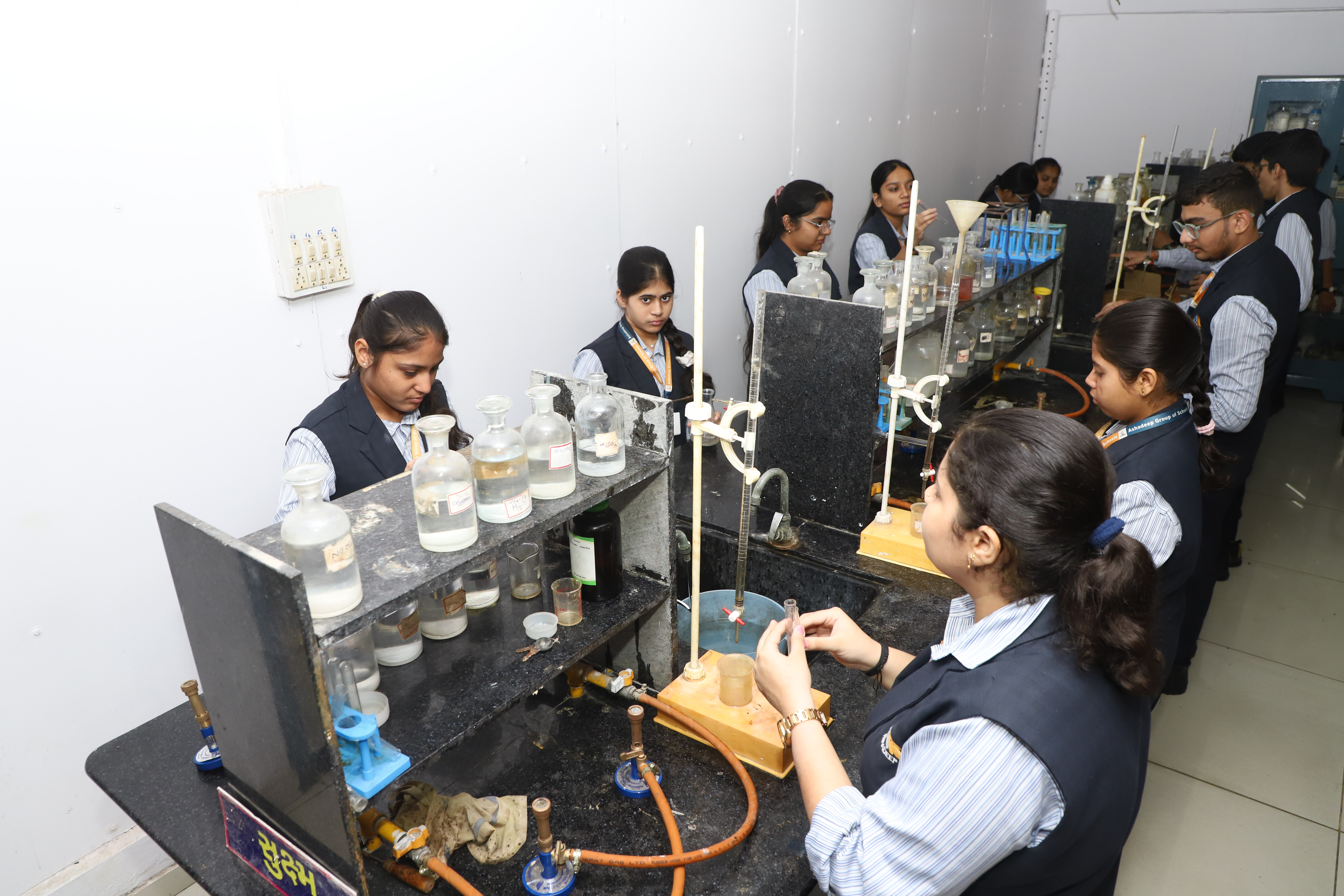 અમારી શાળામાં વિદ્યાર્થીઓના સર્વાંગી વિકાસ અને પ્રાયોગિક શિક્ષણને પ્રોત્સાહન આપવા માટે એક ભવ્ય અને સુરક્ષિત કેમિસ્ટ્રી લેબ સુવિધા ઉપલબ્ધ કરવામાં આવી છે. આ લેબ માત્ર એક ઓરડો નથી, પરંતુ જિજ્ઞાસુ વિદ્યાર્થીઓ માટે સંશોધનનું કેન્દ્ર છે. <br> લેબની મુખ્ય વિશેષતાઓ અને લેટેસ્ટ સાધનો: અમારી પ્રયોગશાળા તમામ લેટેસ્ટ સાધનો (Latest Equipments) થી સજ્જ છે, જે વિદ્યાર્થીઓને જટિલ રાસાયણિક પ્રક્રિયાઓ સમજવામાં મદદરૂપ થાય છે: અમારી શાળામાં વિદ્યાર્થીઓના સર્વાંગી વિકાસ અને પ્રાયોગિક શિક્ષણને પ્રોત્સાહન આપવા માટે એક ભવ્ય અને સુરક્ષિત કેમિસ્ટ્રી લેબ સુવિધા ઉપલબ્ધ કરવામાં આવી છે. આ લેબ માત્ર એક ઓરડો નથી, પરંતુ જિજ્ઞાસુ વિદ્યાર્થીઓ માટે સંશોધનનું કેન્દ્ર છે. લેબની મુખ્ય વિશેષતાઓ અને લેટેસ્ટ સાધનો: અમારી પ્રયોગશાળા તમામ લેટેસ્ટ સાધનો (Latest Equipments) થી સજ્જ છે, જે વિદ્યાર્થીઓને જટિલ રાસાયણિક પ્રક્રિયાઓ સમજવામાં મદદરૂપ થાય છે: આધુનિક ઉપકરણો: લેબમાં ડિજિટલ વેઈંગ મશીન (Digital Balance), સેન્ટ્રીફ્યુજ મશીન, કલરીમીટર અને લેટેસ્ટ માઈક્રોસ્કોપ જેવી સુવિધાઓ ઉપલબ્ધ છે. ગુણવત્તાયુક્ત કેમિકલ્સ: પ્રયોગો માટે જરૂરી તમામ ઉચ્ચ ગુણવત્તાવાળા એસિડ્સ, બેઈઝ અને સોલ્ટ્સનો પૂરતો જથ્થો રાખવામાં આવે છે. સુવ્યવસ્થિત સેટઅપ: દરેક વિદ્યાર્થી માટે અલગથી બ્યુરેટ, પીપેટ અને ટેસ્ટ ટ્યુબ સ્ટેન્ડ સાથેનું પર્સનલ વર્કસ્ટેશન તૈયાર કરવામાં આવ્યું છે. સુરક્ષા વ્યવસ્થા: લેબમાં કામ કરતી વખતે સુરક્ષાને સર્વોપરી રાખવામાં આવી છે. અહીં એક્ઝોસ્ટ ફેન્સ, ફાયર એક્સટિંગ્યુશર (અગ્નિશામક) અને ફર્સ્ટ એઈડ કીટની સંપૂર્ણ વ્યવસ્થા છે. શિક્ષણ પર અસર: આ આધુનિક પ્રયોગશાળાને કારણે વિદ્યાર્થીઓ ધોરણ ૧૦ અને ૧૨ની બોર્ડની પ્રાયોગિક પરીક્ષાઓ માટે આત્મવિશ્વાસ સાથે તૈયારી કરી શકે છે. અનુભવી શિક્ષકોના માર્ગદર્શન હેઠળ વિદ્યાર્થીઓ જાતે પ્રયોગો કરીને વિજ્ઞાનના સિદ્ધાંતોને જીવંત રીતે નિહાળે છે. નિષ્કર્ષ: અમારી શાળાની આ કેમિસ્ટ્રી લેબ વિદ્યાર્થીઓને વૈજ્ઞાનિક અભિગમ કેળવવામાં અને ભવિષ્યના ડૉક્ટરો કે એન્જિનિયરો બનવા માટે મજબૂત પાયો પૂરો પાડે છે.લેબમાં ડિજિટલ વેઈંગ મશીન (Digital Balance), સેન્ટ્રીફ્યુજ મશીન, કલરીમીટર અને લેટેસ્ટ માઈક્રોસ્કોપ જેવી સુવિધાઓ ઉપલબ્ધ છે. ગુણવત્તાયુક્ત કેમિકલ્સ: પ્રયોગો માટે જરૂરી તમામ ઉચ્ચ ગુણવત્તાવાળા એસિડ્સ, બેઈઝ અને સોલ્ટ્સનો પૂરતો જથ્થો રાખવામાં આવે છે. સુવ્યવસ્થિત સેટઅપ: દરેક વિદ્યાર્થી માટે અલગથી બ્યુરેટ, પીપેટ અને ટેસ્ટ ટ્યુબ સ્ટેન્ડ સાથેનું પર્સનલ વર્કસ્ટેશન તૈયાર કરવામાં આવ્યું છે. સુરક્ષા વ્યવસ્થા: લેબમાં કામ કરતી વખતે સુરક્ષાને સર્વોપરી રાખવામાં આવી છે. અહીં એક્ઝોસ્ટ ફેન્સ, ફાયર એક્સટિંગ્યુશર (અગ્નિશામક) અને ફર્સ્ટ એ