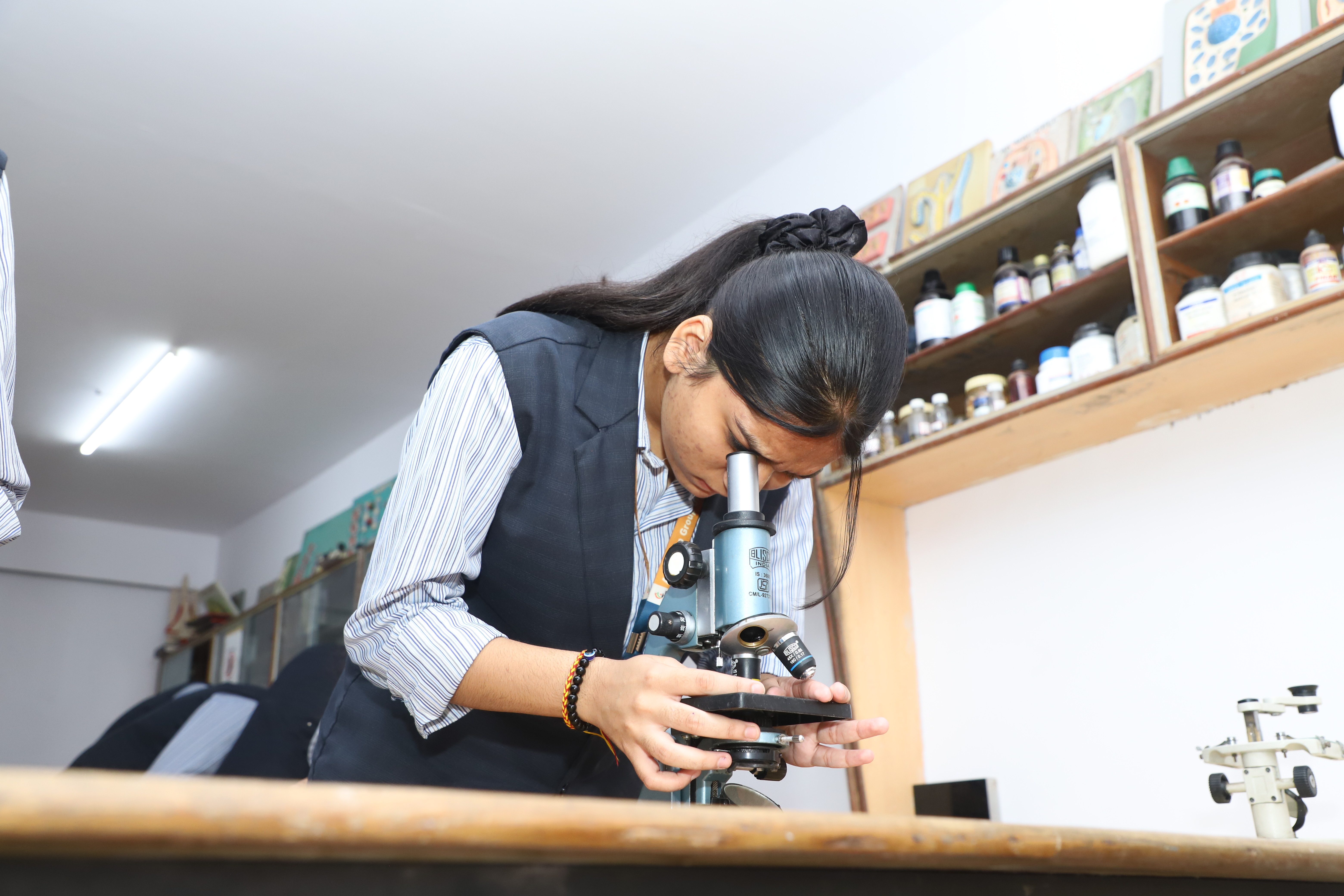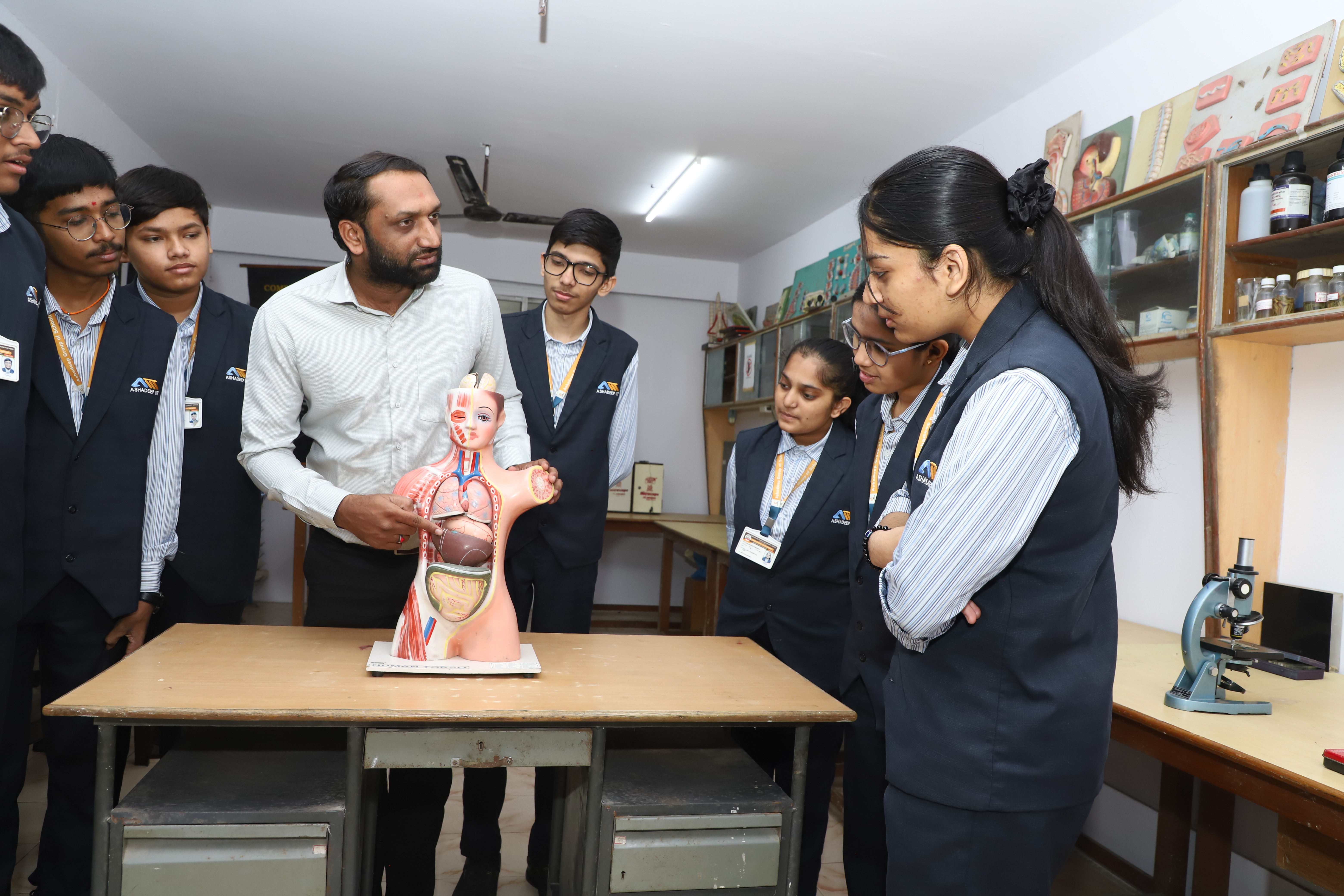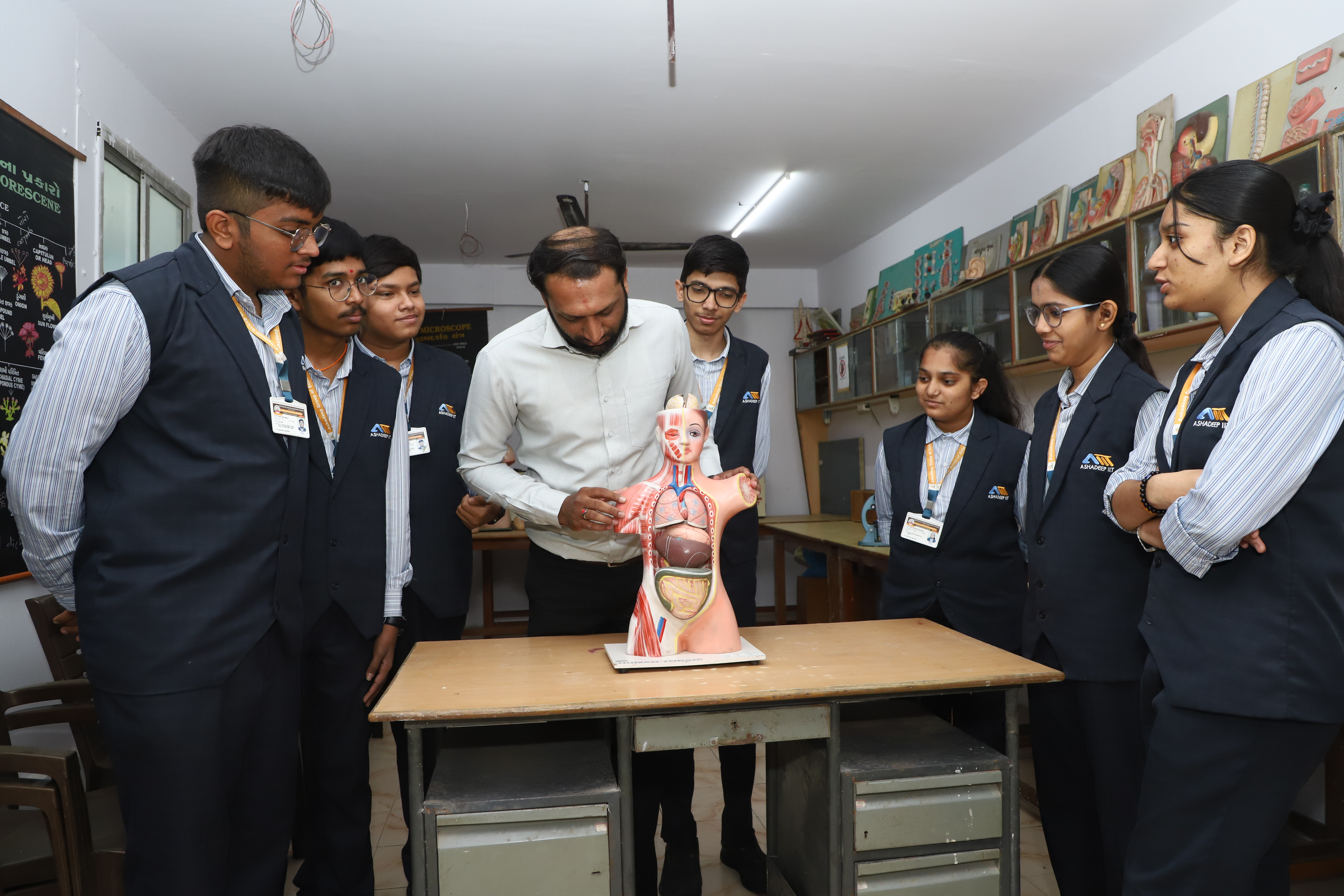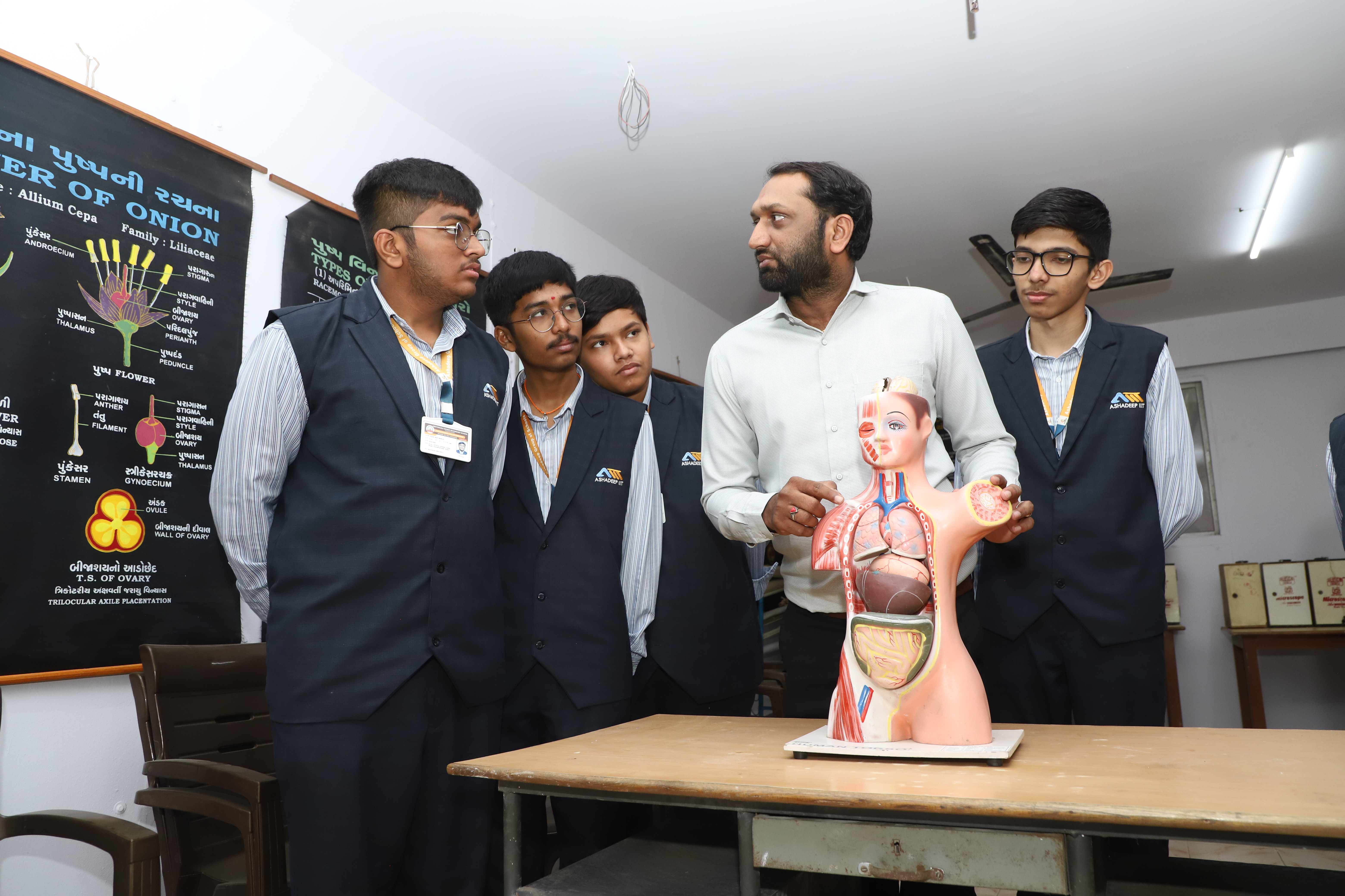 વિજ્ઞાન એ માત્ર પુસ્તકોમાં વાંચવાનો વિષય નથી, પરંતુ તેને અનુભવવાનો વિષય છે. આ હેતુને સાર્થક કરવા માટે અમારી શાળામાં 'અદ્યતન બાયોલોજી લેબોરેટરી' તૈયાર કરવામાં આવી છે, જે ધોરણ ૧૦ અને ૧૨ના વિદ્યાર્થીઓ માટે સંશોધન અને શીખવાનું ઉત્તમ કેન્દ્ર બની રહી છે. લેબોરેટરીની મુખ્ય વિશેષતાઓ: નવીનતમ ઉપકરણો: લેબમાં હાઈ-રિઝોલ્યુશનવાળા 'કમ્પાઉન્ડ માઈક્રોસ્કોપ' અને 'ડિજિટલ માઈક્રોસ્કોપ' ઉપલબ્ધ છે, જેના દ્વારા વિદ્યાર્થીઓ કોષ રચના (Cell Structure) અને સૂક્ષ્મ જીવોનું ચોકસાઈથી નિરીક્ષણ કરી શકે છે. 3D મોડલ્સ અને ચાર્ટ્સ: માનવ શરીરના અંગો, હૃદયની રચના, અને DNA સ્ટ્રક્ચરના સચોટ 3D મોડલ્સ દ્વારા જટિલ સિદ્ધાંતોને સમજવા ખૂબ જ સરળ બન્યા છે. સંપૂર્ણ સુરક્ષા વ્યવસ્થા: પ્રયોગો દરમિયાન વિદ્યાર્થીઓની સુરક્ષા માટે તમામ જરૂરી સુરક્ષા સાધનો અને ફર્સ્ટ-એડ કિટની સુવિધા અહીં ઉપલબ્ધ છે. નમૂનાઓનું કલેક્શન : વિવિધ વનસ્પતિઓ અને પ્રાણીઓના સંગ્રહિત નમૂનાઓ વિદ્યાર્થીઓને જીવવિજ્ઞાનની વિવિધતા સમજવામાં મદદરૂપ થાય છે. વિદ્યાર્થીઓ માટે ફાયદા: આ સુવિધાને કારણે વિદ્યાર્થીઓ માત્ર થીયરી જ નહીં, પણ પ્રાયોગિક રીતે પ્રયોગો કરીને વિજ્ઞાનના મૂળભૂત પાયા મજબૂત કરી રહ્યા છે. ખાસ કરીને બોર્ડની પરીક્ષા આપતા વિદ્યાર્થીઓ માટે આ લેબ પ્રેક્ટિકલ પરીક્ષાની તૈયારી માટે આશીર્વાદરૂપ સાબિત થઈ રહી છે.
